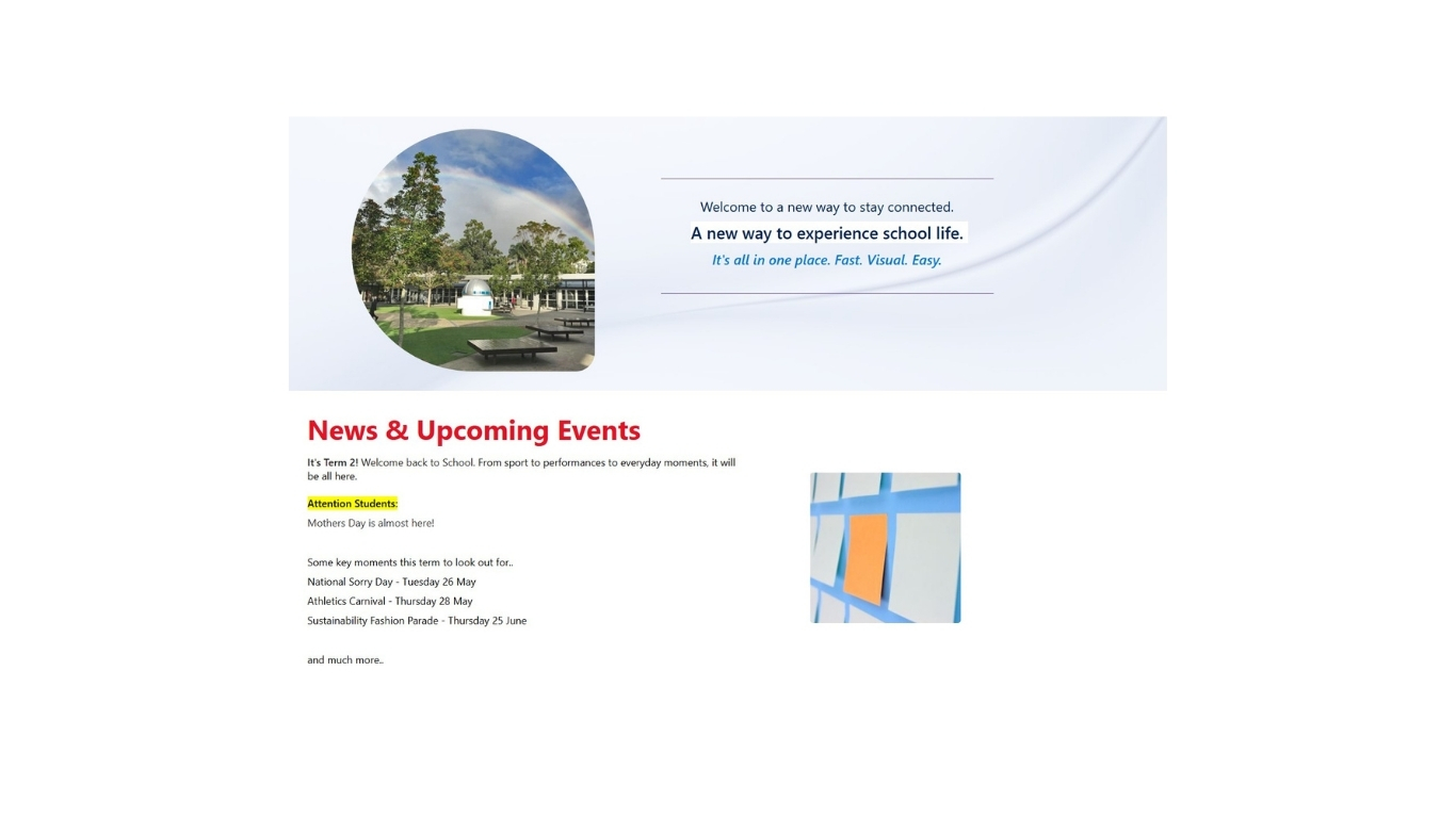 This term, we are introducing a new way to stay connected. Students can now access a reimagined SharePoint platform through their devices. It is more visual and intuitive, bringing together the many aspects of school life in one place. From sport and performances to everyday classroom moments, it has been designed as a safe, school managed space where students can engage more deeply with school life and stay informed.
